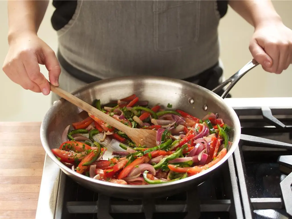 Meanwhile, in a large saute pan over high heat add 1 Tbsp Olive Oil. Once hot, add the pepper and onion mixture and Salt (1 tsp) and cook for 5 minutes.
