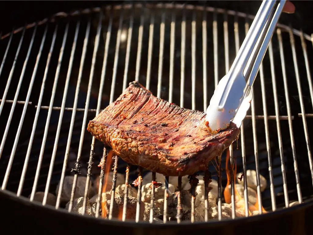 Place the flank steak on the hottest side of the grill and cook for 2 minutes. After 2 minutes give the steak a quarter turn on the grill to create cross hatch grill mark.