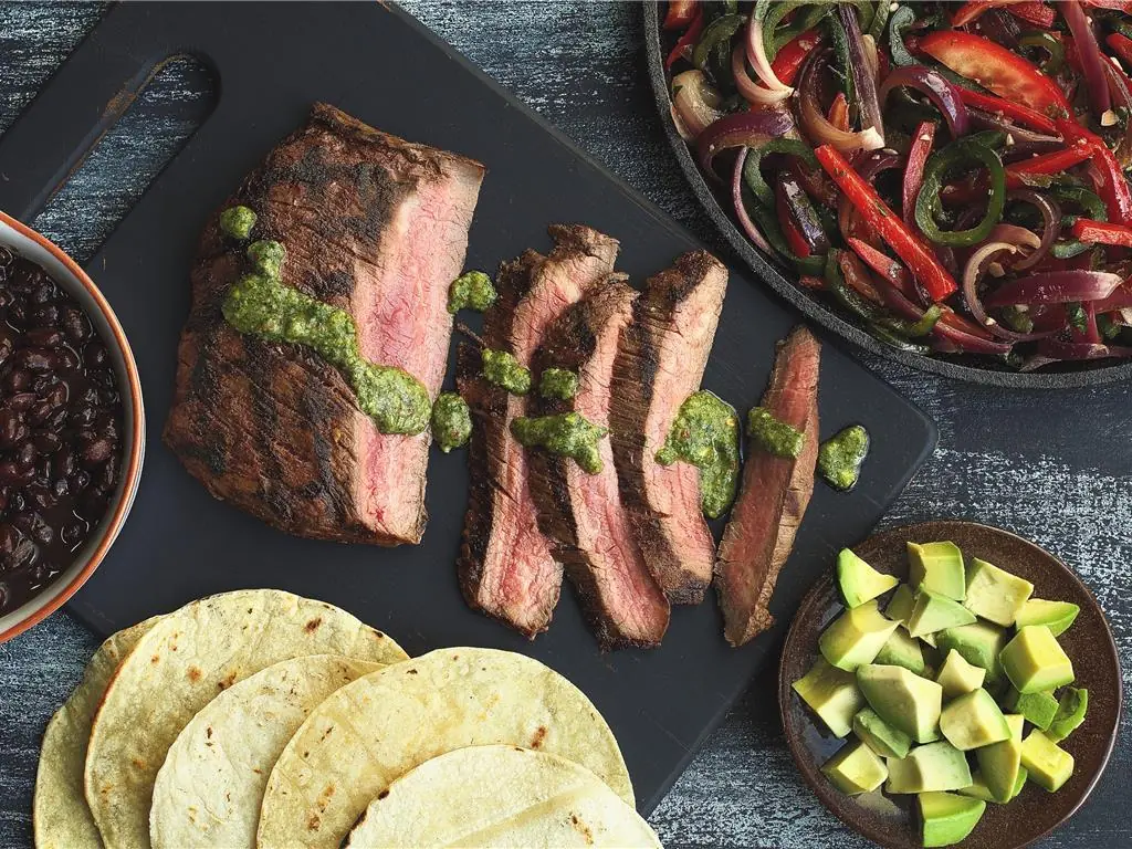 Slice the flank steak in 1/2-inch slices against the grain. Drizzle the chimichurri over the meat. Place bell pepper mixture, cumin lime black beans, avocado, and corn tortillas on the side. Serve family-style.