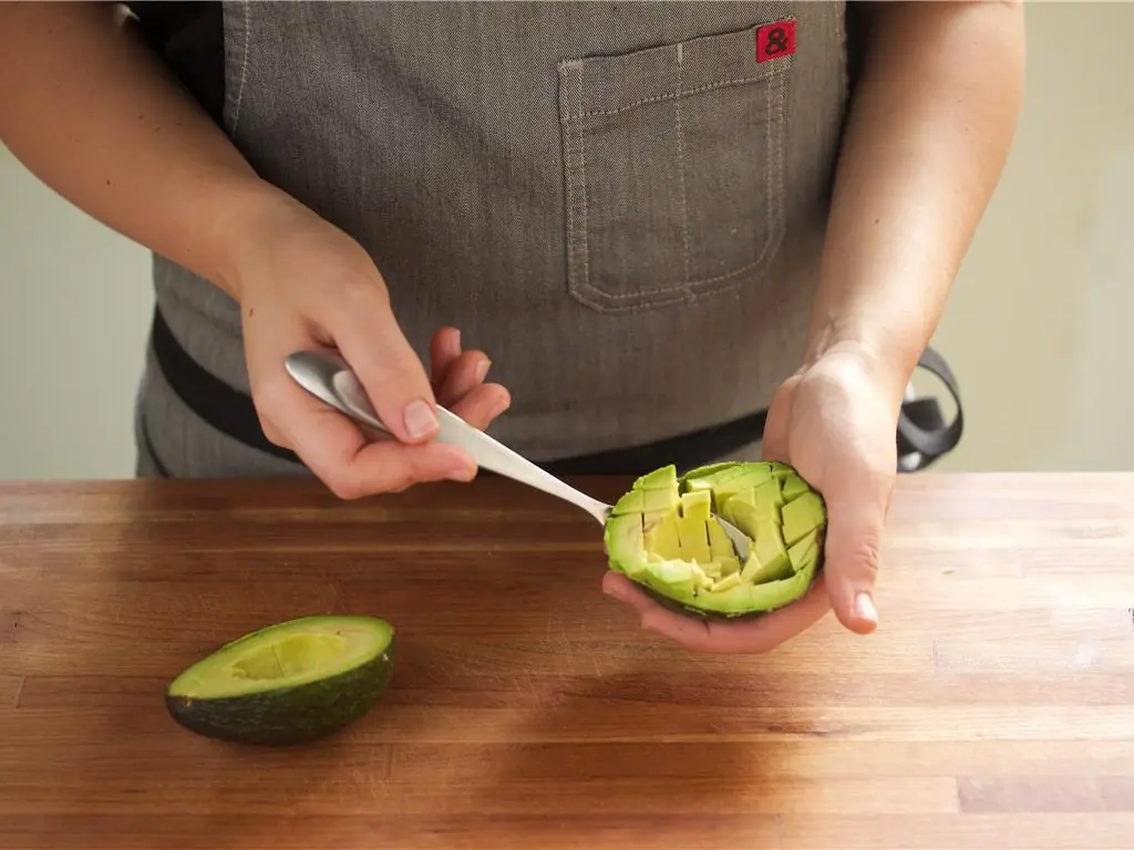 Cut the Avocado (1) in half around the pit, remove and discard the pit. Using your knife, score avocado flesh without piercing the skin, and scoop out the flesh.