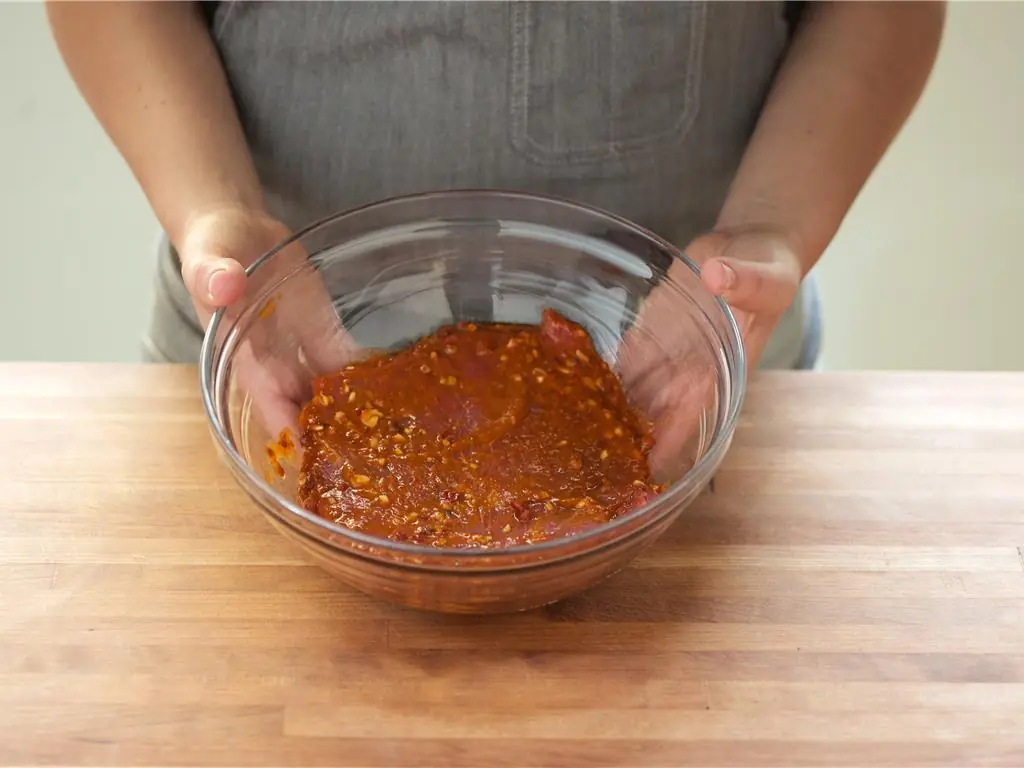 Pat dry Flank Steak (14 oz) with paper towels and set aside. Add the flank steak to the bowl with the marinade and evenly coat. Cover with plastic wrap and refrigerate until ready to use.