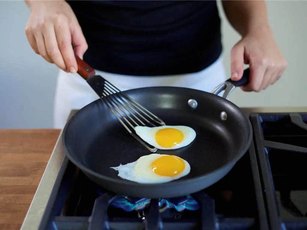 Season eggs with pinch of salt and pepper. Lower the heat to low, place a lid on the pan and cook eggs for two to three minutes until the whites are set but the yolk is still runny. Remove pan from heat, and be ready to serve immediately.