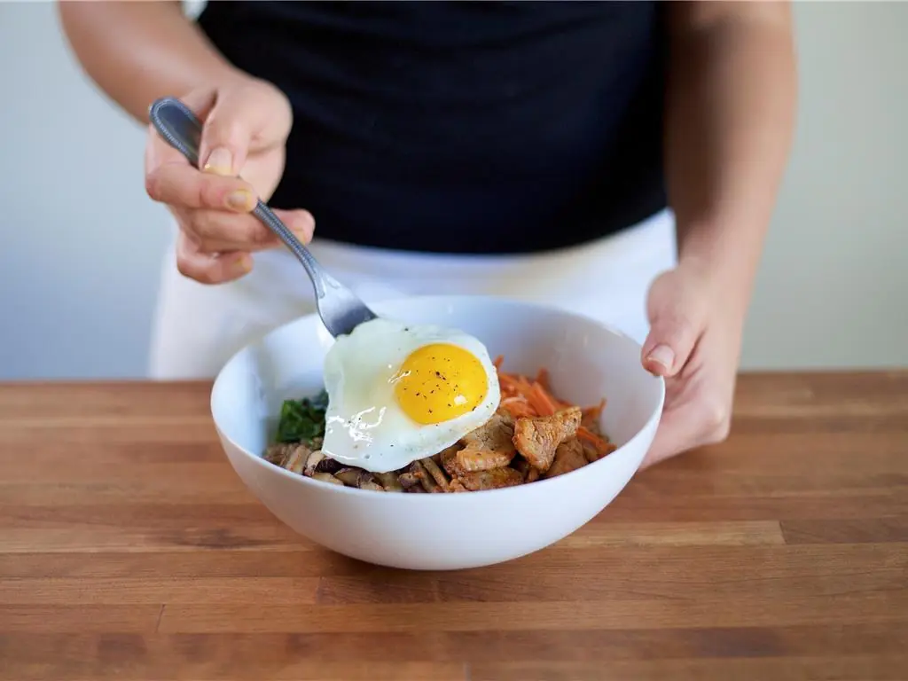 Finally, place the pork in between the carrots and the mushrooms. Drizzle with the remaining sauce. Top each bowl with a fried egg.