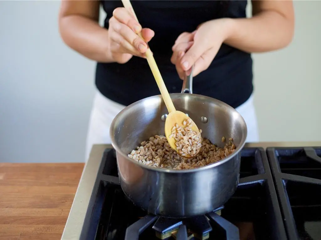 In a small saucepan over high heat, add two cups of water and Salt (1/2 tsp) Bring to a boil. Add Farro (2/3 cup), cover, and cook for fifteen minutes. When farro is finished, drain and set aside.
