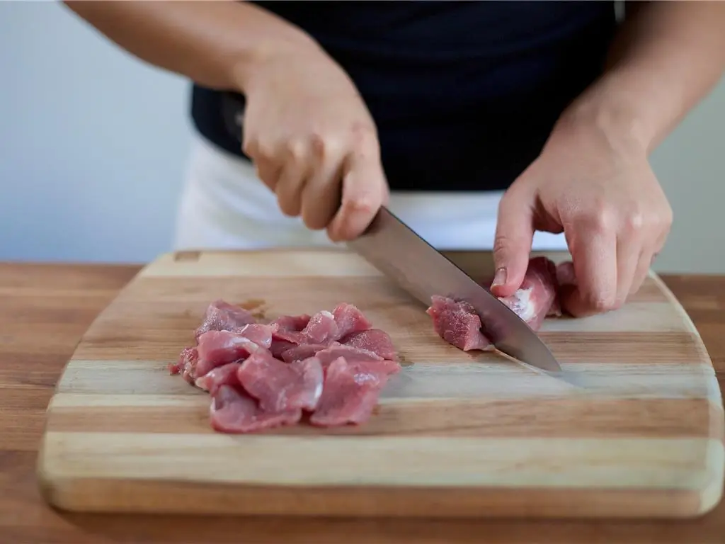 Pat dry Pork Tenderloin (8 oz) with paper towels. Slice the pork tenderloin in half lengthwise and then across into quarter inch strips. Place in a second small bowl. Season the pork with Salt (1/4 tsp) and Ground Black Pepper (1/4 tsp). Set aside.