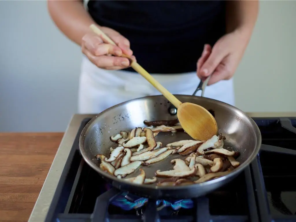 Meanwhile, remove stems from Shiitake Mushroom (1 cup) and discard. Slice lengthwise into quarter inch strips and set aside. Peel the fresh Fresh Ginger (1 1/3 Tbsp), mince, and place in a small bowl.