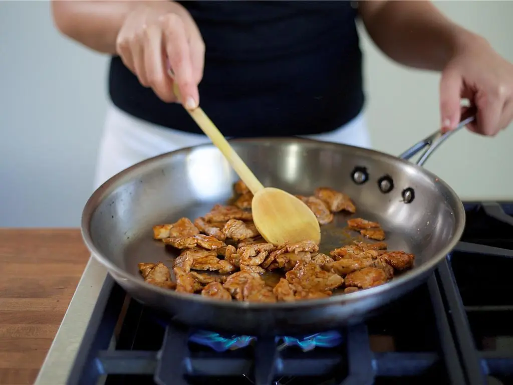 Add two teaspoons of oil to the pan. When hot, add the pork and cook for one to two minutes on both sides until cooked through.