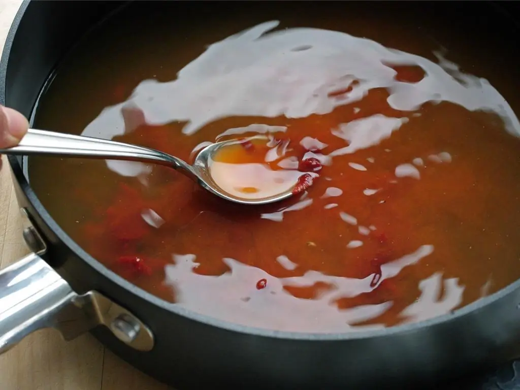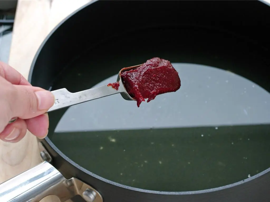 Pour the reserved stock in a non stick pan. Add Gochujang (1/3 cup) to the pan.