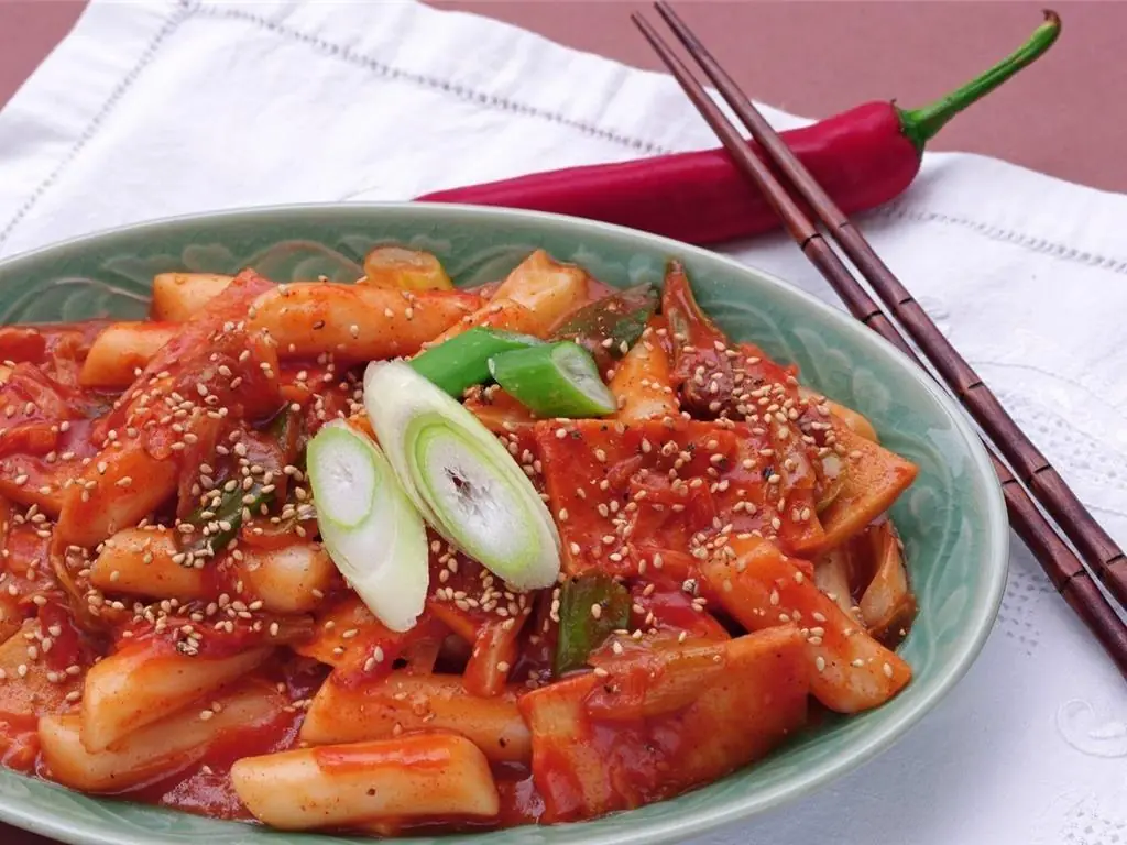 Spicy goddess, the soft yet chewy rice cakes slobbered with spicy chili paste gochujang sauce!…. along with other things such as deep fried calamaris, vegetable fritters