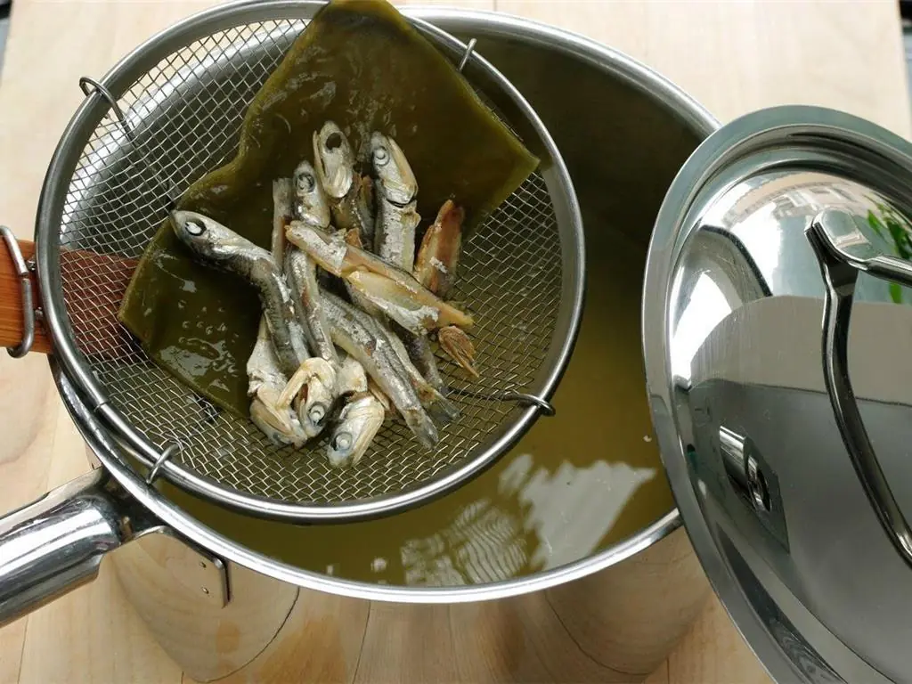 First, dunk Dried Anchovies (10) and Dried Sea Kelp (1 piece) in Water (4 1/2 cups) to make a stock. Boil first and reduce heat to low. Cover and simmer for 10 minutes.