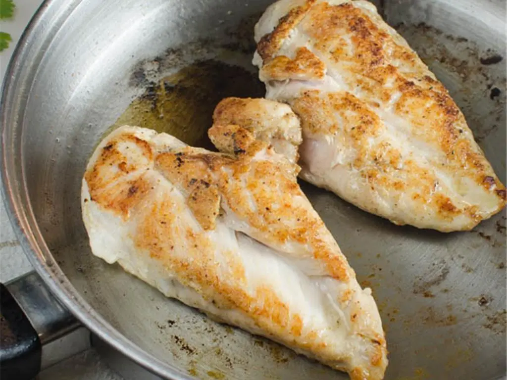 In a skillet over medium high heat, add the Olive Oil (2 Tbsp). Carefully add the organic chicken breasts to the hot skillet and cook for 3-4 minutes on each side until golden brown. Transfer organic chicken breasts to a plate.