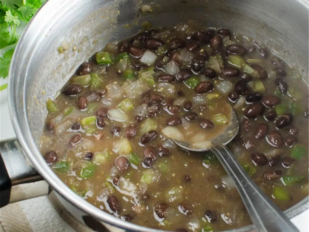 Stir in the GOYA® Black Beans (1 cup) (liquid and all) and Salsa Verde (4 Tbsp). Heat to boil and reduce heat to a medium simmer, cook for 5 minutes.