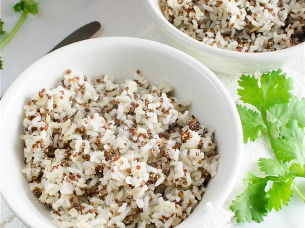 Heat the Frozen Quinoa and Brown Rice Mix (1 2/3 cups) in the microwave according to package directions. To assemble the bowls, divide the quinoa and brown rice mix between two bowls.