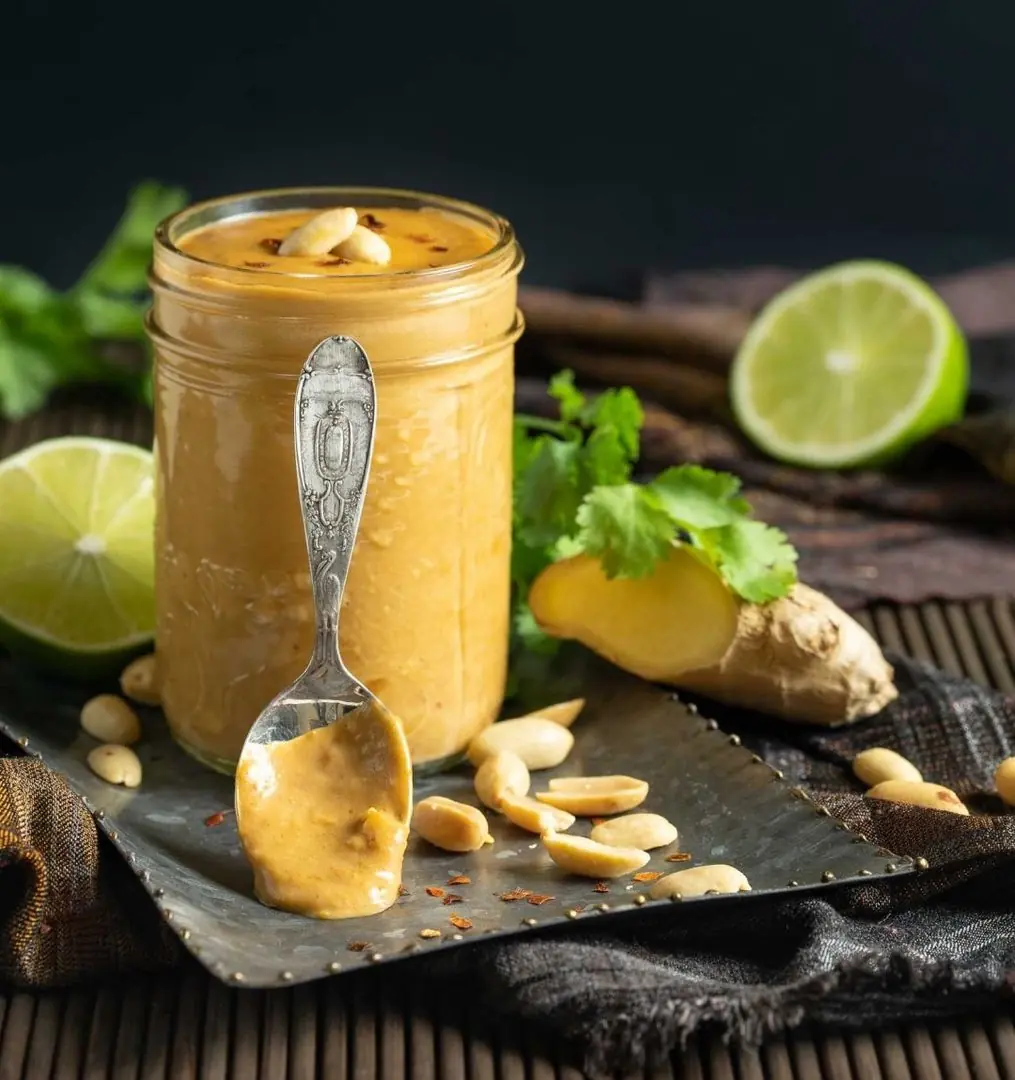 Combine Natural Peanut Butter (1/2 cup), Coconut Milk (1/2 cup), Water (4 Tbsp), Low-Sodium Soy Sauce (2 Tbsp), Brown Sugar (1 Tbsp), Rice Vinegar (2 tsp), Chili Paste (2 tsp), Garlic (1 clove), Fresh Ginger (1 tsp), Red Curry Paste (1 tsp), juice of the Lime (1/2) and Kosher Salt (1 pinch) in a medium saucepan.