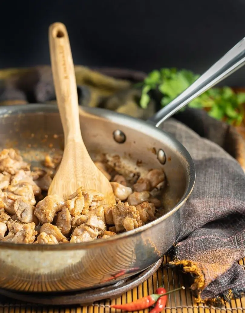 Meanwhile, heat remaining Oil (1 Tbsp) over medium-high heat in a wok or large skillet. Add chicken slices and cook until lightly browned and cooked through, tossing occasionally for about 6 minutes.