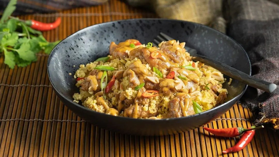 Spicy Peanut Chicken with Couscous comes together in a snap and is full of flavor with just a touch of spicy heat.