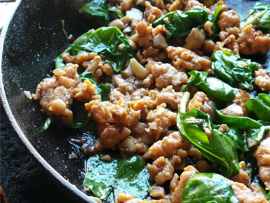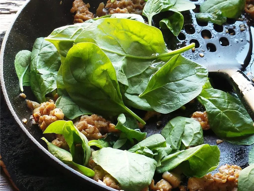 Add the Garlic (2 cloves) and Crushed Red Pepper Flakes (1 pinch) and cook until fragrant, about 30 seconds. Add the Spinach Leaves (2 cups) and cook until it's wilted.