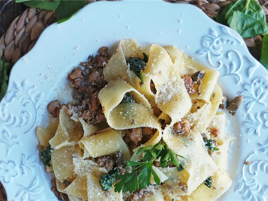 Quick, inexpensive, fresh, and tasty โ this is the ideal meal for when you don't have time to waste and want something delicious. This dish is made with simple ingredients ranging from spicy chicken sausage, button mushrooms, fresh spinach, creamy ricotta, and thick Pappardelle pasta.