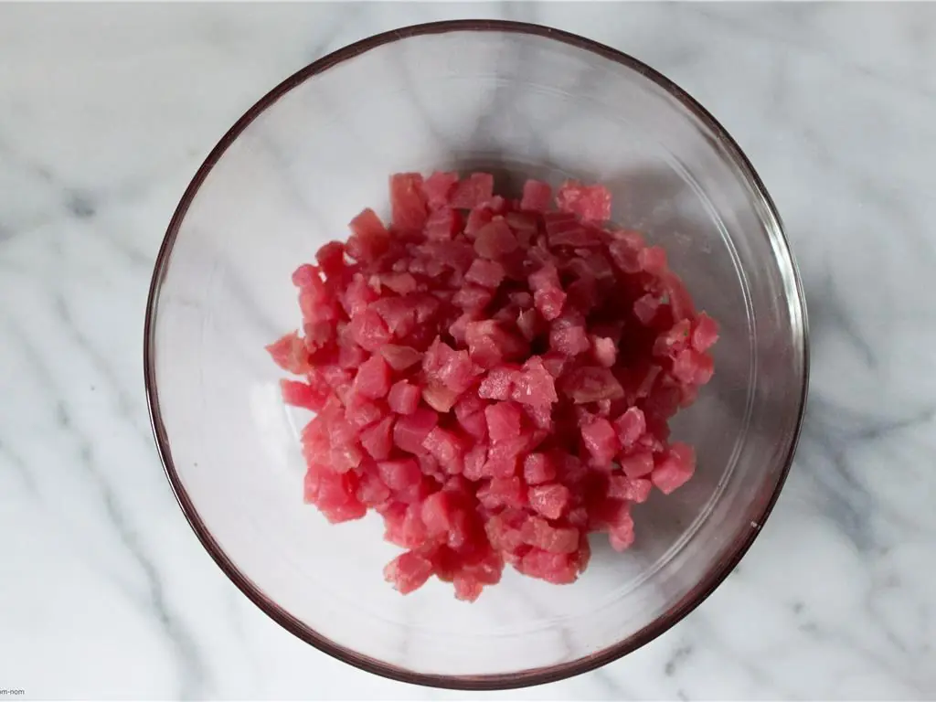 Cut the Sushi-Grade Tuna Fillet (1 lb) into a 1/4-inch dice and add to a large bowl.