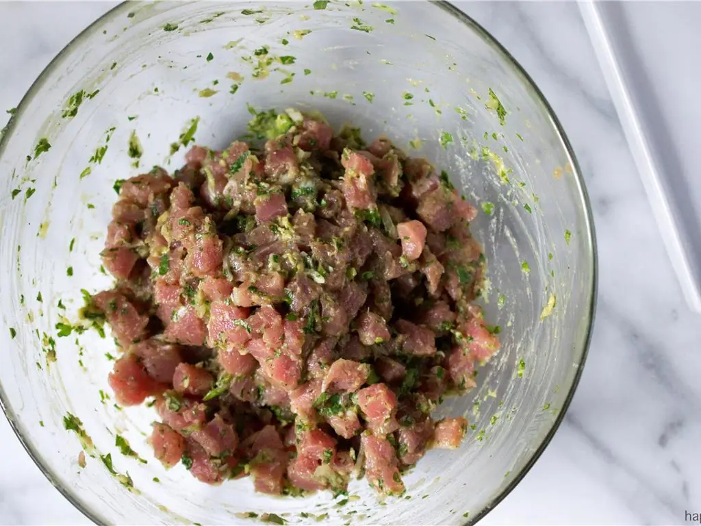 Add the Scallion (1 bunch), Fresh Cilantro (2 Tbsp), Fresh Ginger (1 tsp), Red Bird's Eye Chili Pepper (1), Avocado (1/2), Kosher Salt (1/2 tsp), and Ground Black Pepper (1/4 tsp) to the tuna. Gently work with your hands to incorporate all of the ingredients.