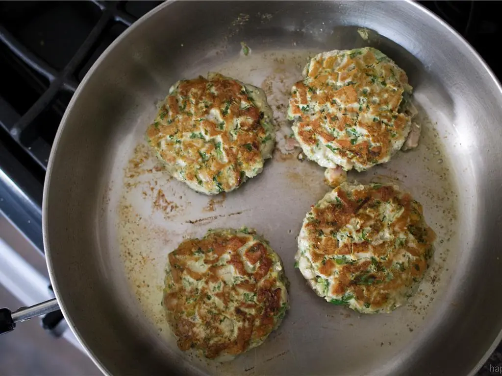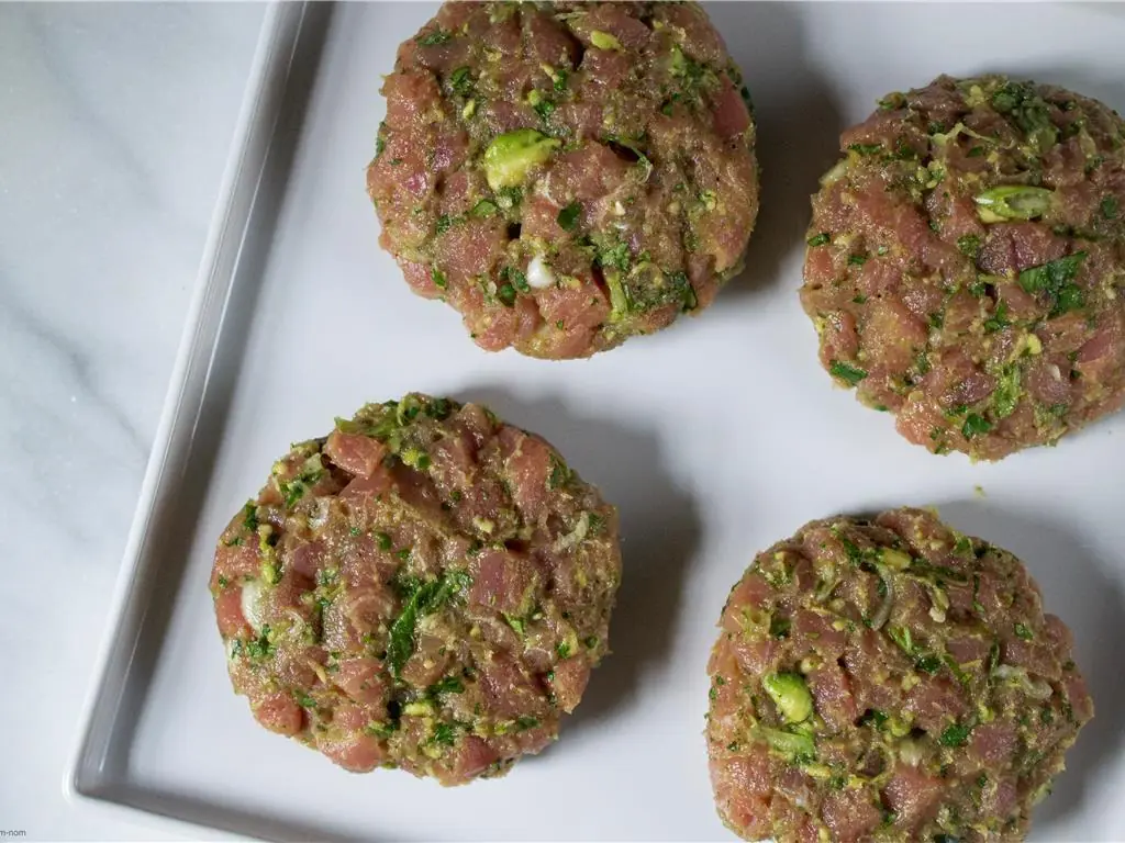 Divide the contents of the bowl into 4 equal portions and shape into 1-inch thick patties. Cover and refrigerate for 20 minutes and up to 2 hours.