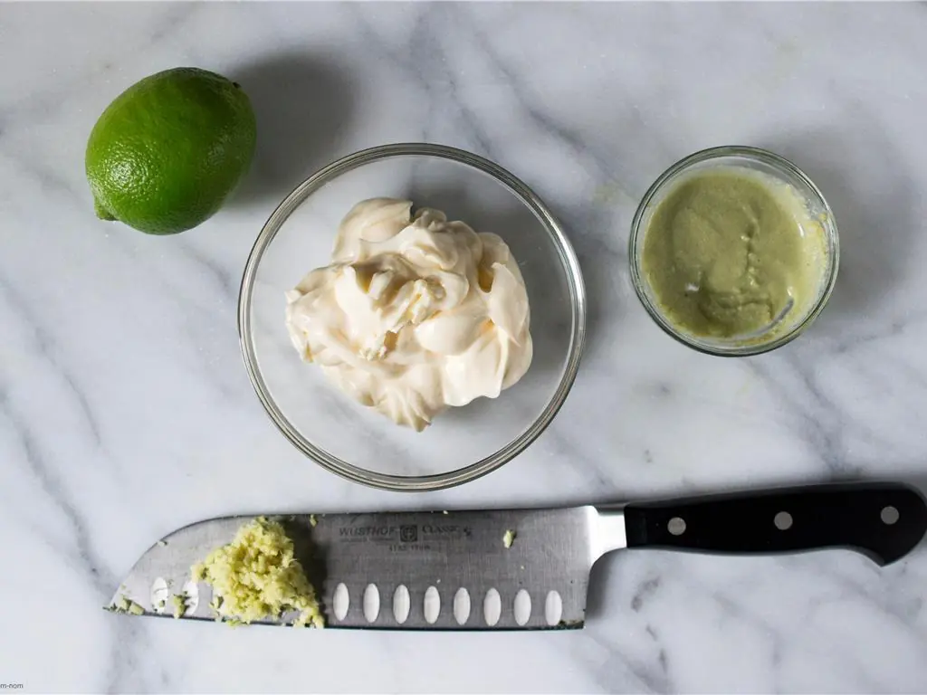 Make the wasabi mayo. In a small bowl, add the Wasabi Paste (1 1/2 Tbsp), Mayonnaise (1/2 cup), Lime (1), and Fresh Ginger (1 tsp). Stir well to combine. Cover and refrigerate until ready to use.