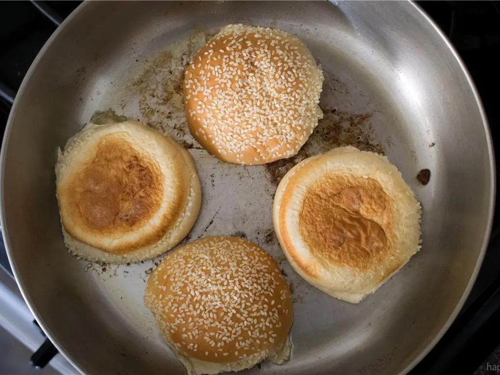 With the remaining oil in the pan, toast the Sesame Hamburger Buns (4) for 1 minute. Add more oil if needed.