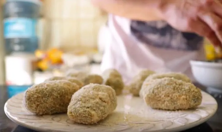 Cover with breadcrumbs, then dip into the egg wash, and then back into the breadcrumbs. Set aside. Repeat until all the mixture is done. You should end up with 8-10 croquettes.