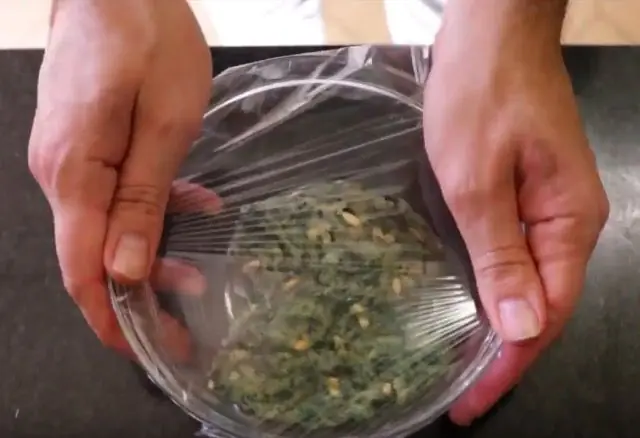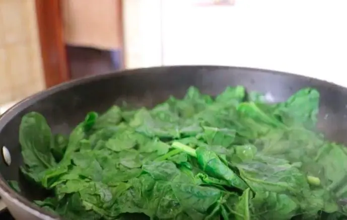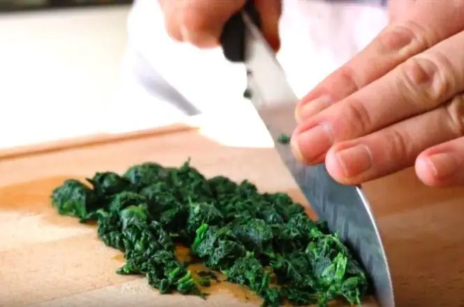 Remove the lid and mix the spinach, then transfer the spinach to a sieve with a bowl underneath. Using a wooden spoon, push down on the spinach to remove all the excess liquid. Once done, roughly chop the spinach and set aside.