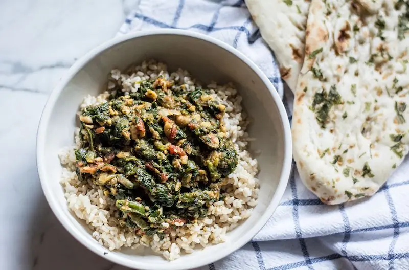Spinach Masala with Brown Rice and Naan Bread