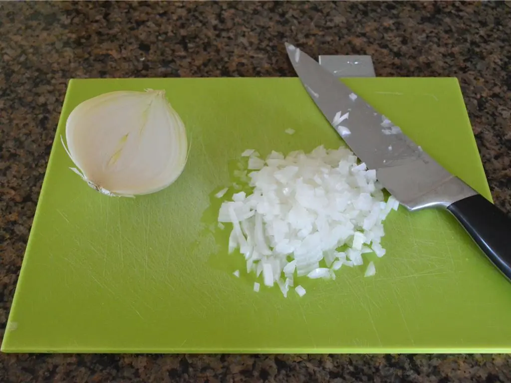Finely dice the Onion (1/2) and mince the Garlic (1 clove).