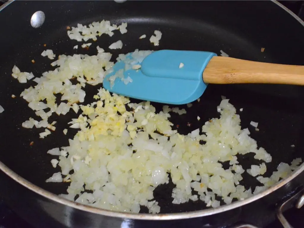 Heat Olive Oil (1 Tbsp) in a pan over medium heat and sauté the diced onion until it turns soft and translucent. Then add the minced garlic and sauté for another minute or so.
