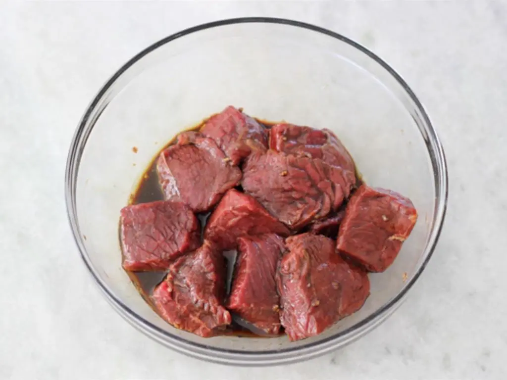 Add Soy Sauce (1 Tbsp), Balsamic Vinegar (1 tsp), Red Wine (1 Tbsp), Worcestershire Sauce (1 tsp), Garlic (2 cloves), Olive Oil (2 Tbsp), Salt (to taste), and Ground Black Pepper (to taste) to a mixing bowl. Add the Beef (1 lb) and let marinade.