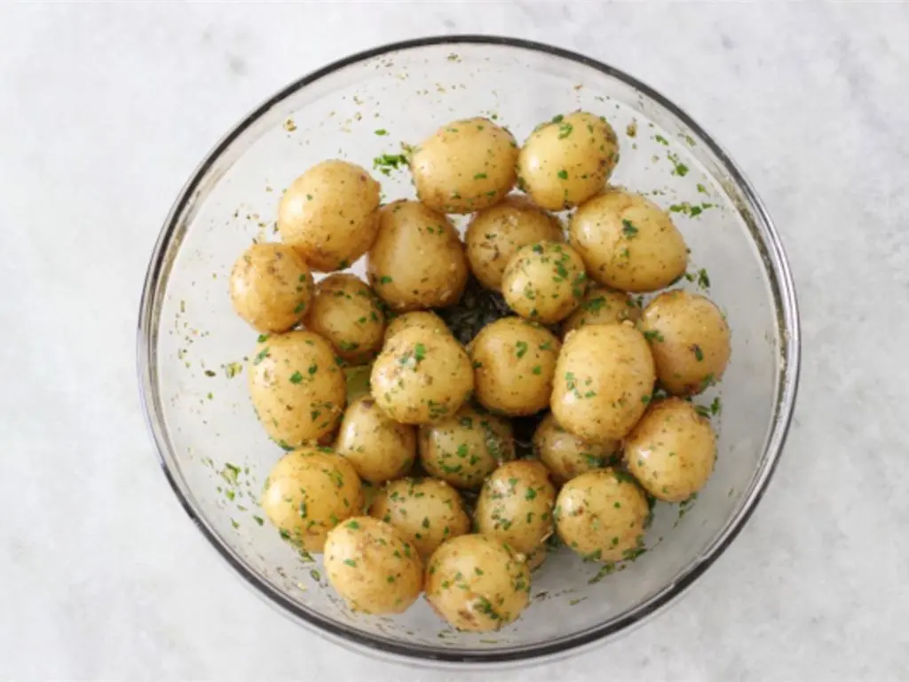 While the potatoes are cooking, in a large mixing bowl, combine 2 Tbsp olive oil, Garlic (1 clove), Fresh Thyme (1 tsp), Fresh Parsley (1 Tbsp), Dried Mixed Herbs (1 tsp) and season with salt and pepper.