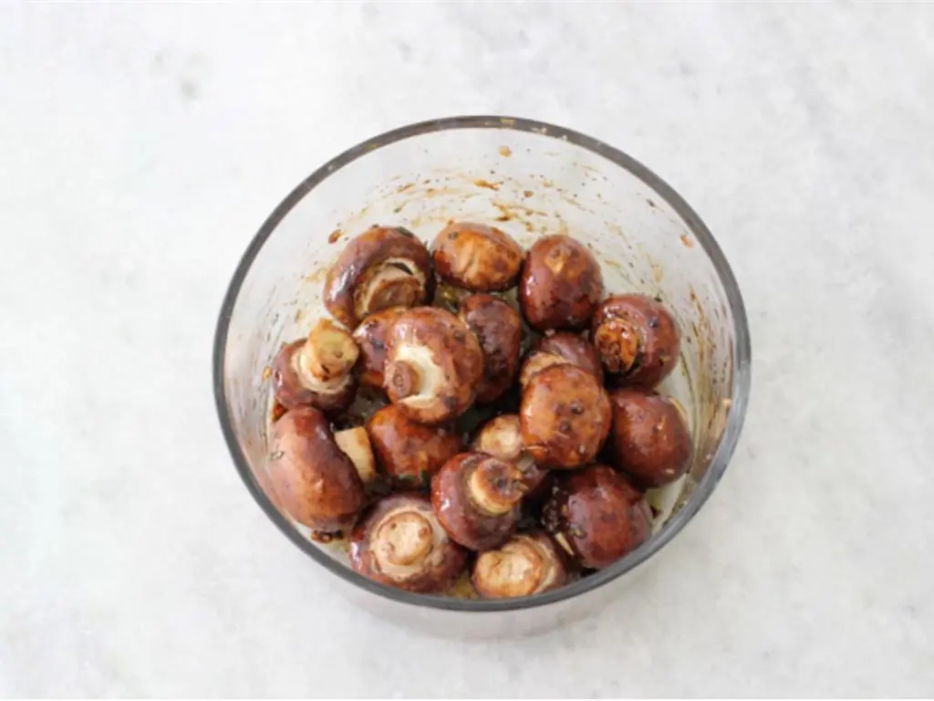Prepare the mushrooms right before you are ready to thread the skewers. Toss together Mushrooms (2 3/4 cups), Olive Oil (3 Tbsp), Balsamic Vinegar (1 tsp), Garlic (1 clove), Fresh Thyme (1 tsp), Salt (to taste) and Ground Black Pepper (to taste).