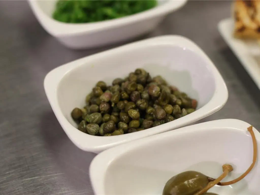 Slice the Whole Caper Berries (2) in half and juice the Lemon (1/2).