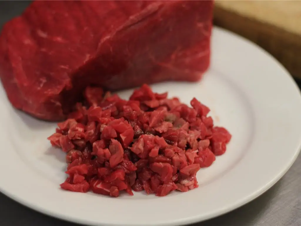 Dice the Beef Sirloin Ball Tip (3 oz) into very small pieces by cutting pieces along the grain, then slicing into strips and finally into a small dice. Make sure to use a sharp knife!