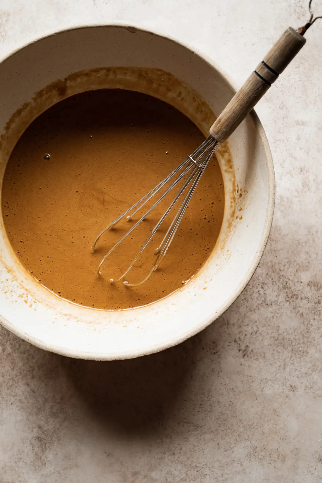 In a separate mixing bowl, add Cooking Oil (1/3 cup) and Dark Brown Sugar (1/2 cup), whisking to combine until mixture is well combined. Add in Unsulphured Mild Molasses (1/2 cup), Honey (4 Tbsp), and dissolved Baking Soda (1 tsp). Whisk until mixture is homogenous.