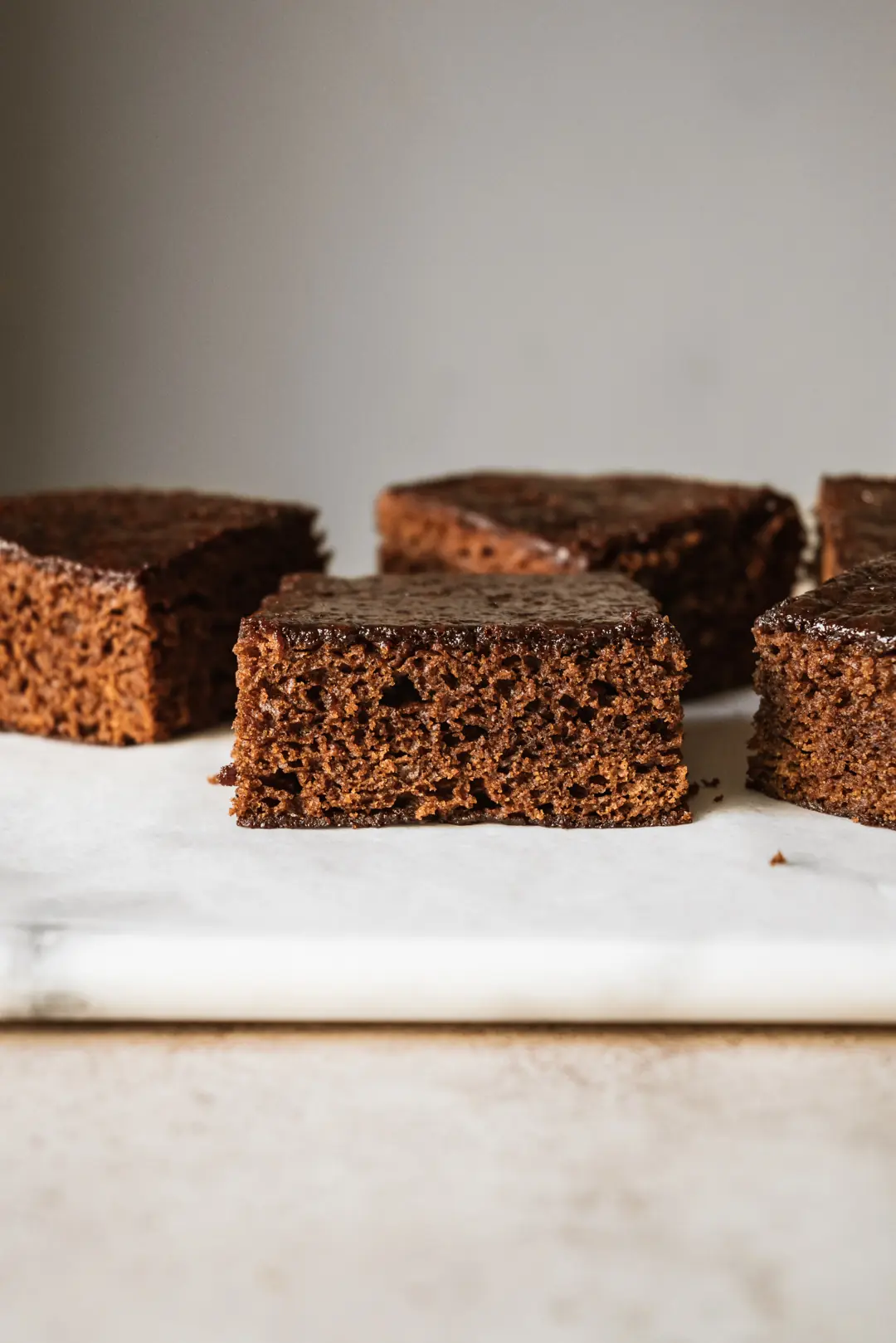 Slice the cake into 9 even squares, setting the cake slices on a parchment-lined plate or storage container. Store covered at room temperature for at least one day to allow stickiness to develop.
