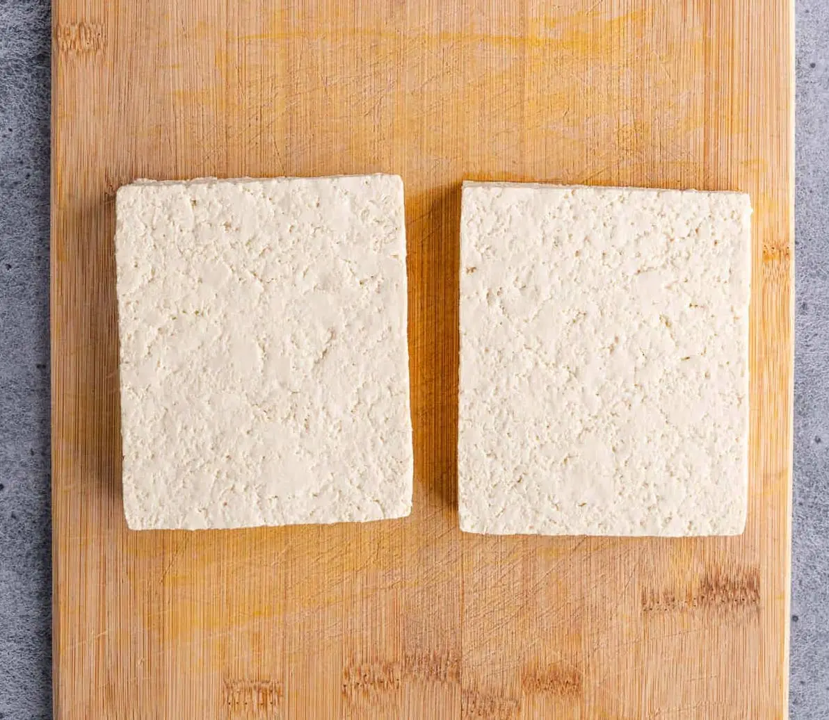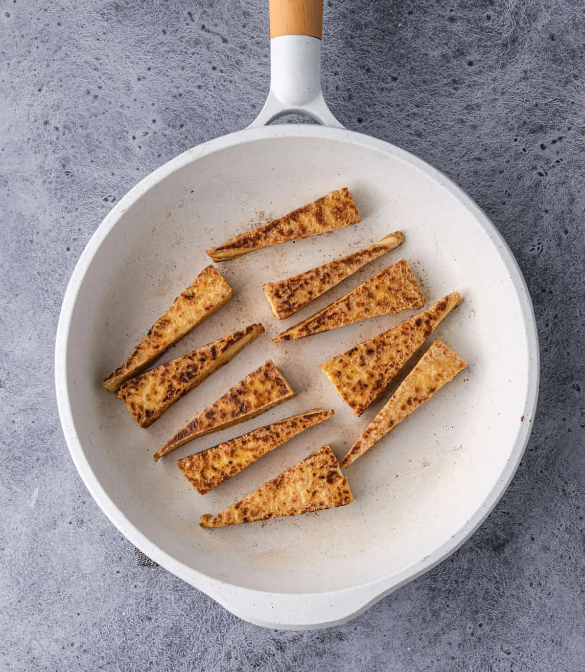 Get a frying pan with olive oil hot before carefully placing your tofu flat on the pan to fry. Allow your tofu to cook until golden brown on both sides — usually about 2 minutes on each side.