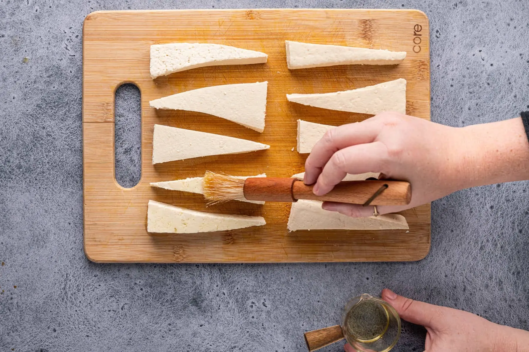 Once most of the liquid is drained from your tofu, cut it into thin strips. You can now choose to either cube the tofu or cut it into triangles as pictured. Coat your tofu pieces in Olive Oil (1 Tbsp), then sprinkle Corn Starch (1 tsp) on both sides.