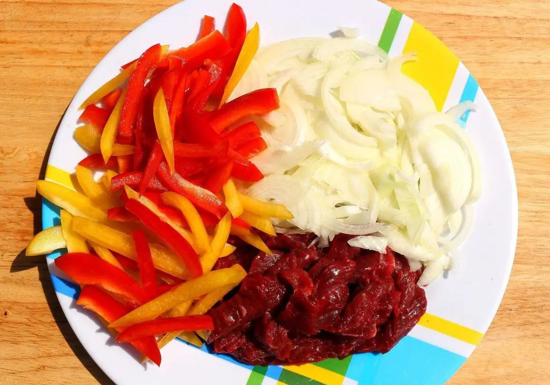 Cut up Red Chili Pepper (1), Orange Bell Pepper (1), and Onion (1). Combine with the beef.