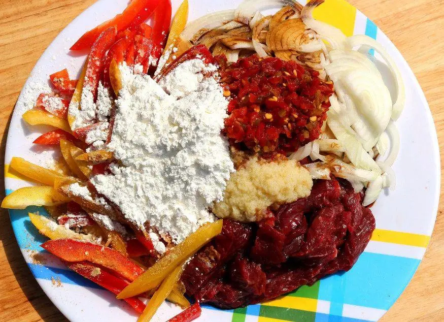 Season with Pimiento Peppers (3 Tbsp), Garlic Paste (1 tsp), Ground Ginger (1/2 tsp), Soy Sauce (1/3 cup), Hoisin Sauce (1 Tbsp), Corn Starch (4 Tbsp), Rice Wine (2 Tbsp), and Kosher Salt (to taste). Mix all ingredients well together and marinade at least one hour.