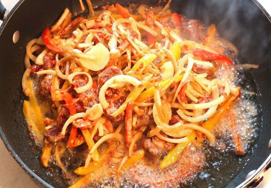 Heat Peanut Oil (1 cup), saute the beef and veggies at 375 degrees F (190 degrees C) until the onions are golden, remove with a slotted spoon, discard fat.