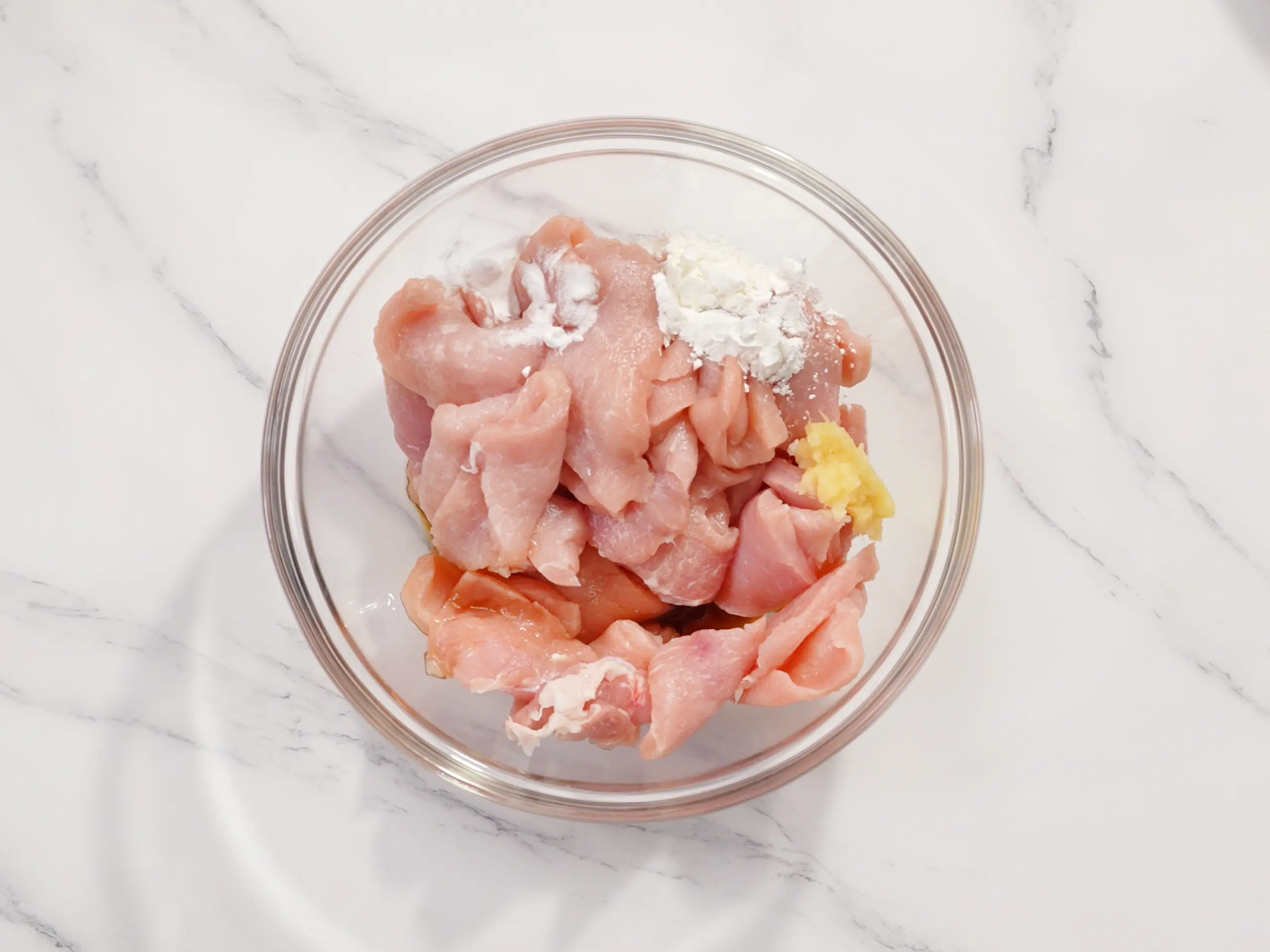 Place the pork in a mixing bowl, add Soy Sauce (1 Tbsp), Shaoxing Cooking Wine (1 tsp), Fresh Ginger (2 tsp), Corn Starch (2 tsp), and Baking Soda (1/2 tsp). Mix until well coated and set aside.