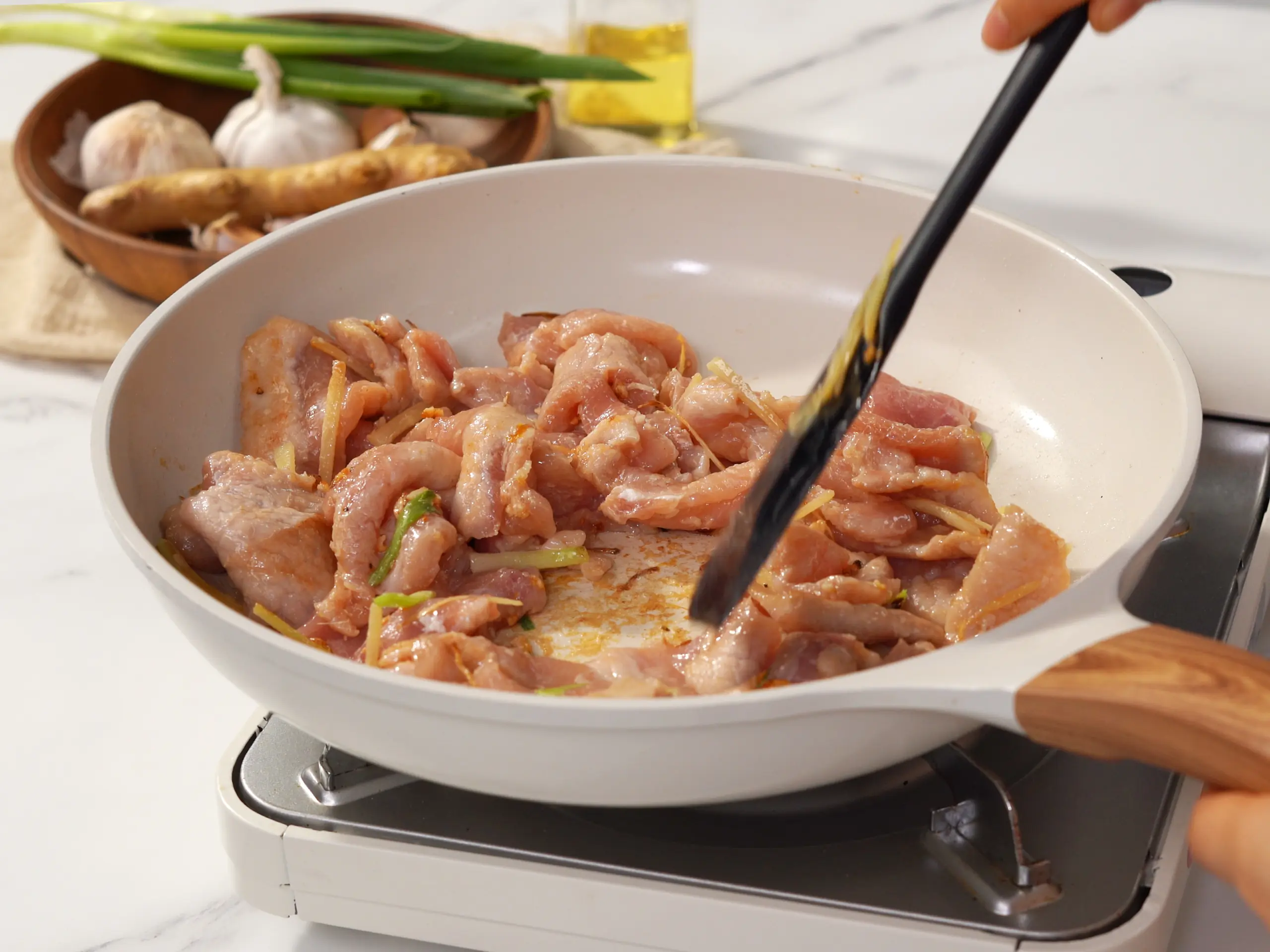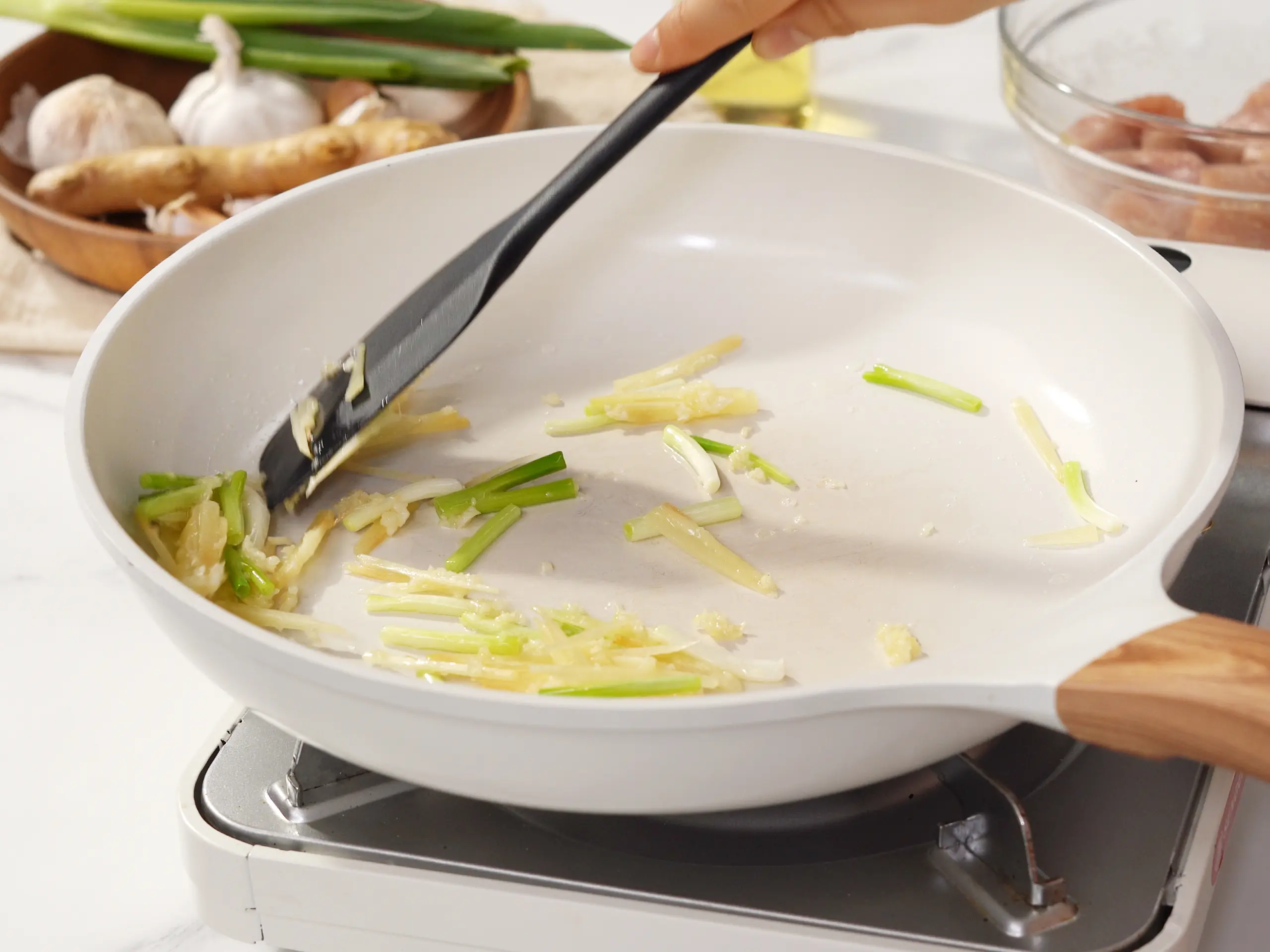 Heat the Cooking Oil (2 Tbsp) in the pan over medium heat, and add Fresh Ginger (1 piece), Garlic (2 cloves), and the white part of the Scallions (3 stalks). Stir until fragrant about 2 minutes.