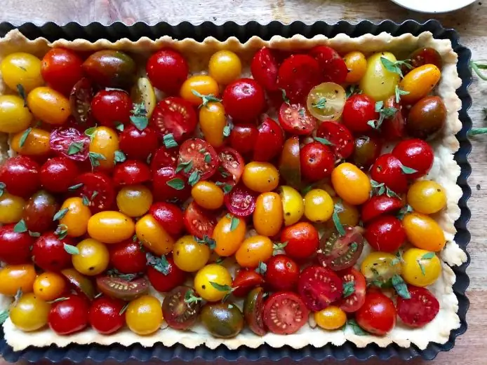 Remove from oven and garnish with the Oregano Leaves (to taste). When cool enough to handle, carefully remove the tart along with the pan bottom from the side wall of the pan. Transfer to a tray or serving dish.
