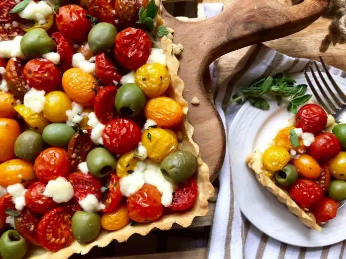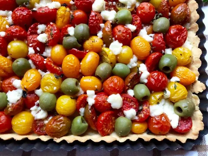 The buttery crust of this Tomato and Olive Tart is layered with pine nuts, then topped off with just-right roasted cherry tomatoes, bright green olives, and a sprinkling of queso fresco.