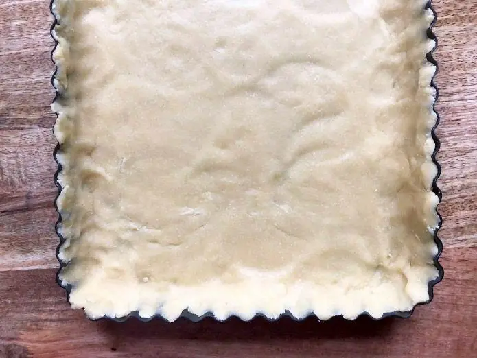 Crumble to distribute evenly in an 11 by 8-inch rectangular tart pan or an 11-inch round pan with removable bottom. Press into the pan so that the dough fills in the corners and is flush with the top edges. Alternatively, gather the dough into a ball and flatten. Roll out the dough between two pieces of parchment paper into a 12 by 9-inch rectangle. Transfer the dough to the tart pan. Press into corners and trim excess.
