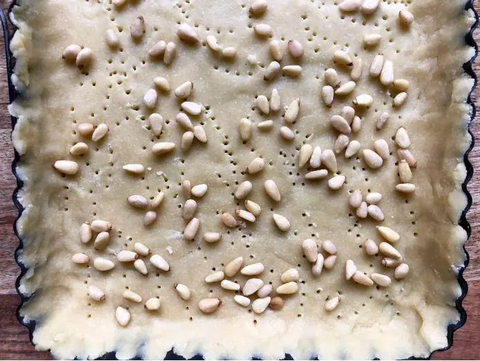 Using the tines of a fork, prick dough all over and sprinkle the Pine Nuts (4 Tbsp) evenly over the surface. Line the pastry with a double thickness of foil.
